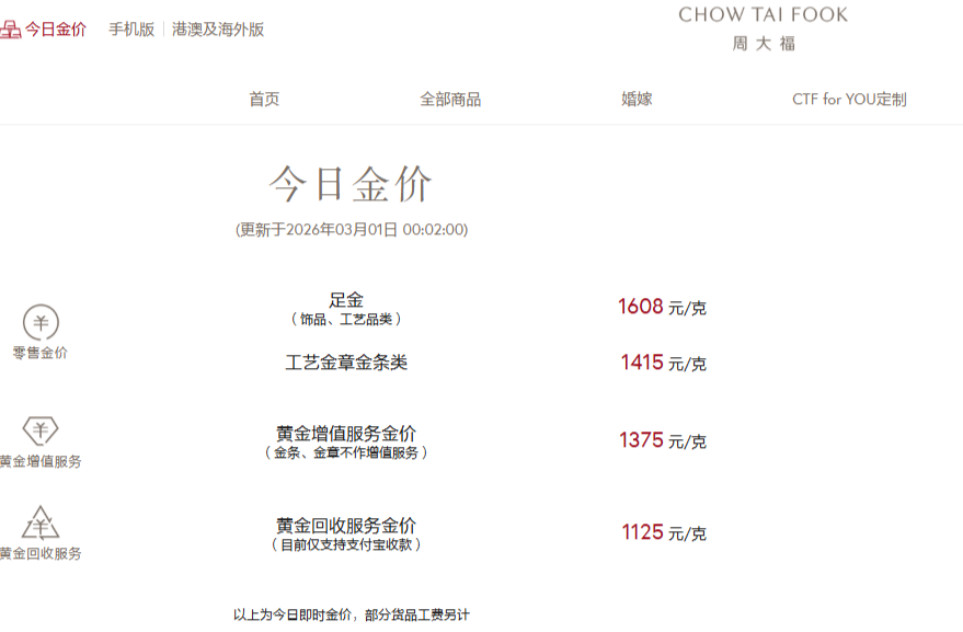 其中,周大福(01929.HK)、豫园股份(600655.SH)旗下老庙黄金足金饰品价格均为1608元/克;周生生(00116.HK)足金饰品价格为1602元/克。